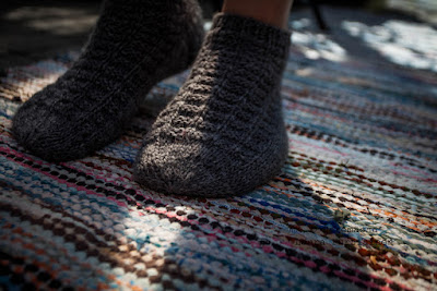 Vaikka kotona kuljen kesät pääasiassa varpaisillaan, niin tämä sukkamalli onkin osottautunut mahdottoman mukavaksi. Osasyy lienee tämä mukavan viileänä pysytellyt kesä ja viileä maa ulkona. Olen huomannut käveleväni sukkasillaan pihahuoneellenikin. Tuosta noin vaan sukkasillaan nurmen yli. Vaikka saattaa olla, että ihan muutaman kerran olen samasta asiasta huomauttanut hieman kireään sävyyn tuolle päivitysversiolleni. Mutta tämä 7 veljestä -lanka kyllä kestää.